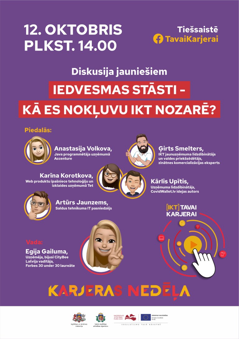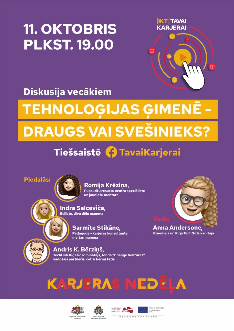 11. oktobrī vecākiem bija iespēja piedalīties diskusijā “Tehnoloģijas ģimenē – draugs vai svešinieks?”, bet 12. oktobrī jauniešu diskusijā “Iedvesmas stāsti – kā es nokļuvu IKT nozarē?” pieredzes stāstos dalījās profesionāļi, kuri darbojas IKT nozarē.