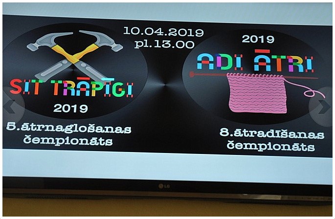 Trešdienas (10.04.2019.) pašā viducī J.Čakstes Liepājas pilsētas 10.vidusskolā tikās rokdarbus iemīļojušie skolēni un viņu skolotāji. Tur norisinājās ikgadējās ātradīšanas un ātrnaglošanas sacensības. Ātrnaglošanas čempionāts ”Sit trāpīgi” notika piekto reizi, savukārt ātradīšanas čempionāts ”Adi ātri” – jau astoto. Par ātrākās adītājas titulu cīnījās 31 meitene, bet savas prasmes darbā ar āmuru rādīja 16 zēni un 9 meitenes. Ādīšanas pārbaudījumā meitenēm vajadzēja 20 minūšu laikā noadīt pēc iespējas vairāk kārtu. Labākais rezultāts bija 36 kārtas. Savukārt ātrnaglošanas sacensību vērtēšanā un organizēšanā iesaistījās paši skolēni. Šogad naglošanas uzdevums ticis sarežģīts. Iepriekš koka klucis ticis iestiprināts galdā un tad skolēni tajā dzinuši naglas. Pēdējā brīdī organizatori izlēmuši naglošanas disciplīnā arī skolotājus likt pie darba. Kaut arī komandā vajadzēja būt diviem zēniem un vienai meitenei, piedalīties gribētāju nav trūcis. Liels paldies Liepājas 8.vidusskolas dalībnikiem un viņu pedagogiem – I.Vasiļjevai, A.Hasnerei un J.Rudzītim par piedalīšanos!