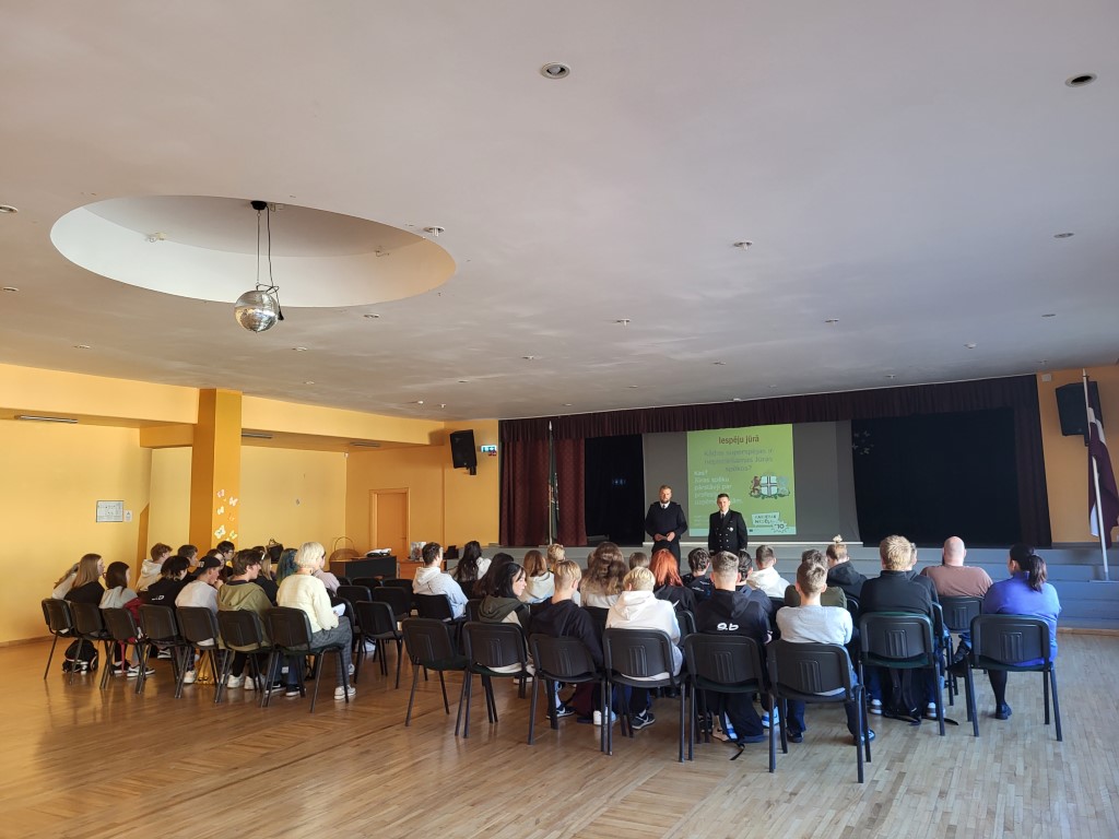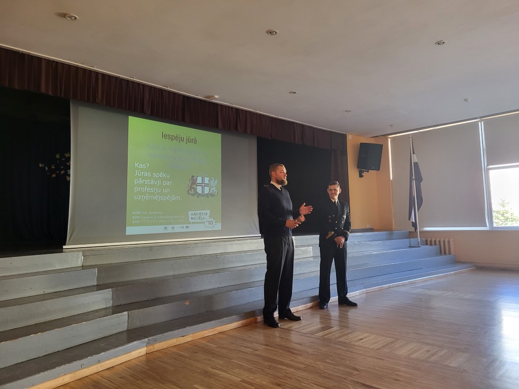 17.10. Liepājas 8. vidusskolā notika pasākums “IeSpēju jūrā”, kurā Jūras spēku pārstāvji pastāstīja 9. klašu skolēniem par to, ko nozīmē darbs dienestā, kādas ir karjeras iespējas Jūras spēkos, kā arī atbildēja uz jautājumiem par savu darba ikdienu. Tikšanās laikā jaunieši dzirdēja, ka fiziskā sagatavotība var tikt pilnveidota, lai varētu stāties dienestā. Svarīgs ir gribasspēks – griba būt dienestā. Komunikācija ir panākuma atslēga produktīvam darbam. Vienmēr ir jābūt gatavam adaptēties, mainīt savus plānus un spēt risināt dažādas problēmas, sevišķi nestandarta situācijās.