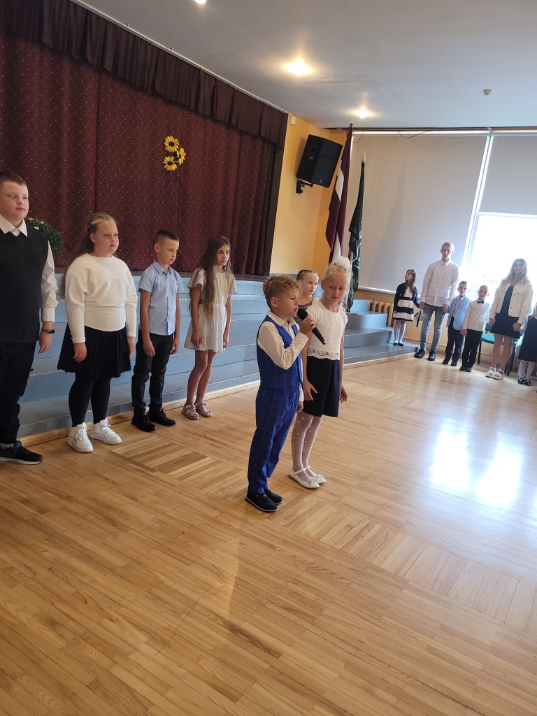 Svinīgajā pasākumā uzstājās jaunāko klašu koris, 2. a klases skolēni Pēteris un Darja apsveica visus skolēnus 1. septembrī.